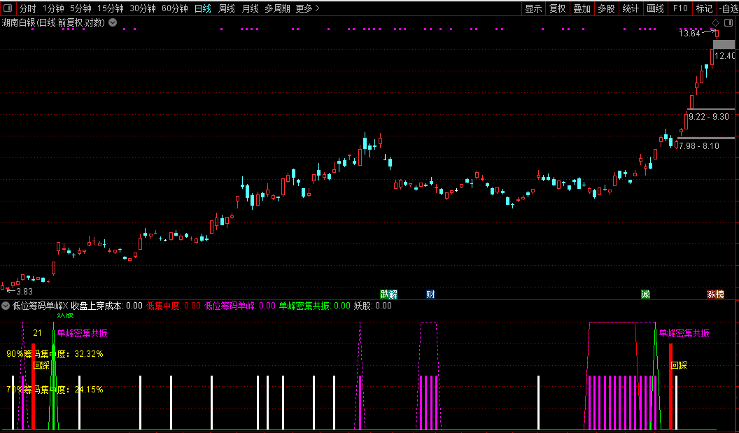 低位筹码单峰副图,副图出现紫色柱密集的地方就可以关注了,低位集中度少于12%后越少越好,阳线 启动向上突破企稳后会现一波行情。