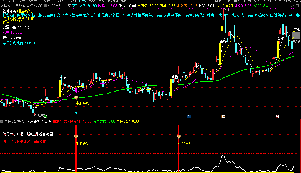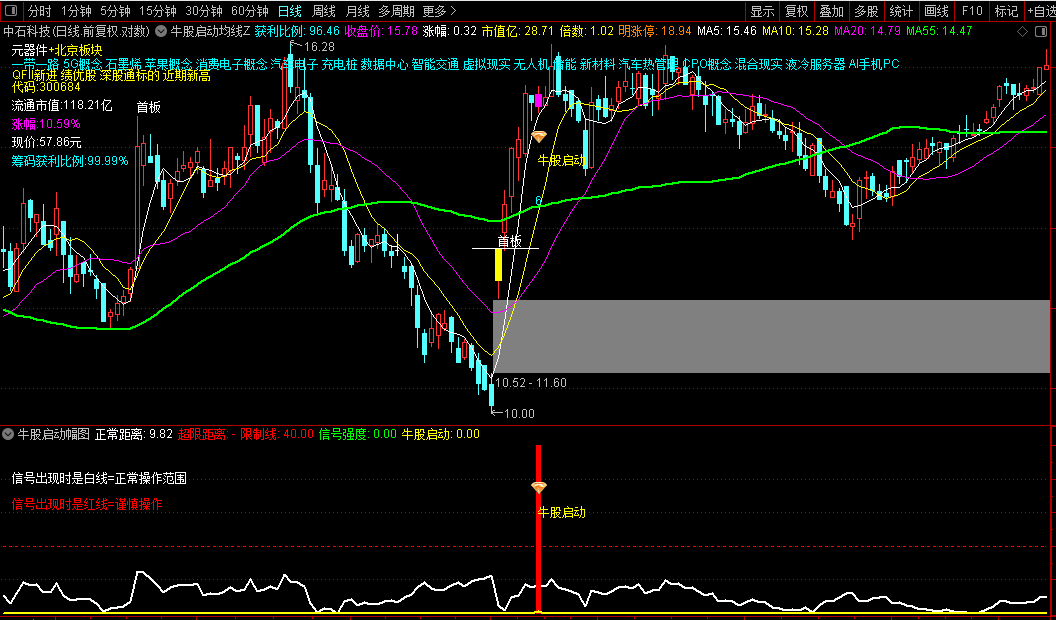副图部分则专门用于监控股价与关键中期均线的距离。它以一根柱线实时显示当前股价偏离该均线的百分比,并用白色和红色进行区分:白色表示处于正常波动范围内,红色则提示偏离过大,需谨慎操作。当主图出现启动信号时,若副图指标线为白色,表明股价处于健康的技术位置,可视为正常操作参考;若为红色,则提示即使出现信号也需保持警惕。