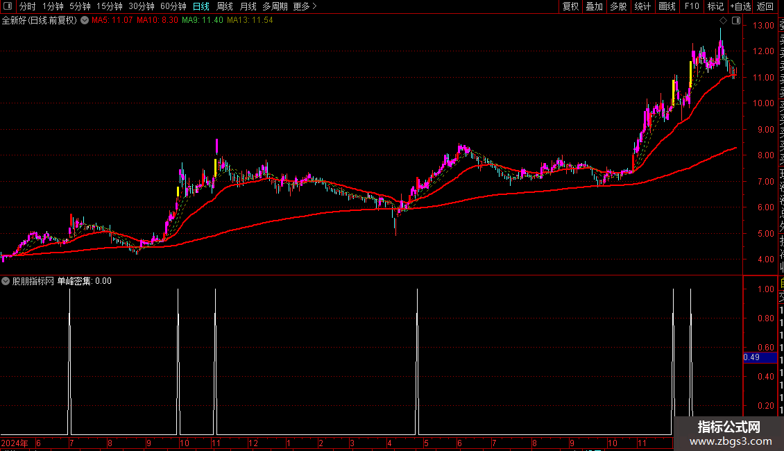 1. 核心信号:当K线下方出现“★低位单峰密集”黄色文字+红色图标,代表个股满足低位筹码单峰密集+起爆量价条件,是核心介入信号;