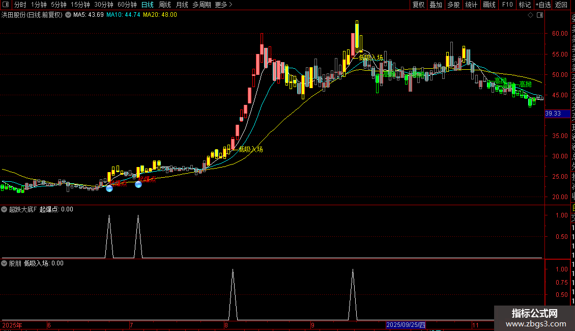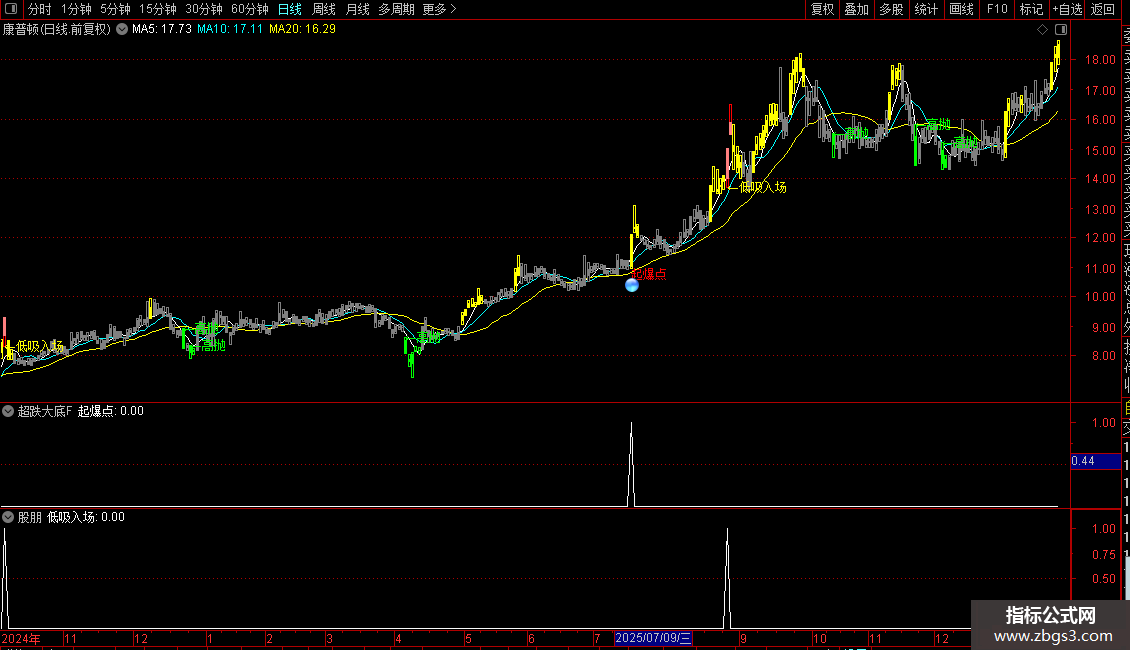 指标通过多条均线与价格区间划分,将市场状态分为五个等级,并用不同颜色的K线直观显示当前所处位置:低位、震荡、高位等。结合成交量、价格突破和短期动量信号,在特定条件组合下提示“低吸入场”“高抛”或“主力拉升”等操作时机。另设“起爆点”信号,用于捕捉放量突破关键压力位且接近涨停的强势启动行情。