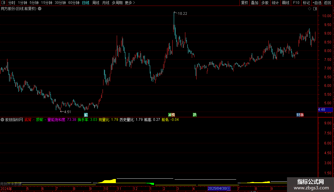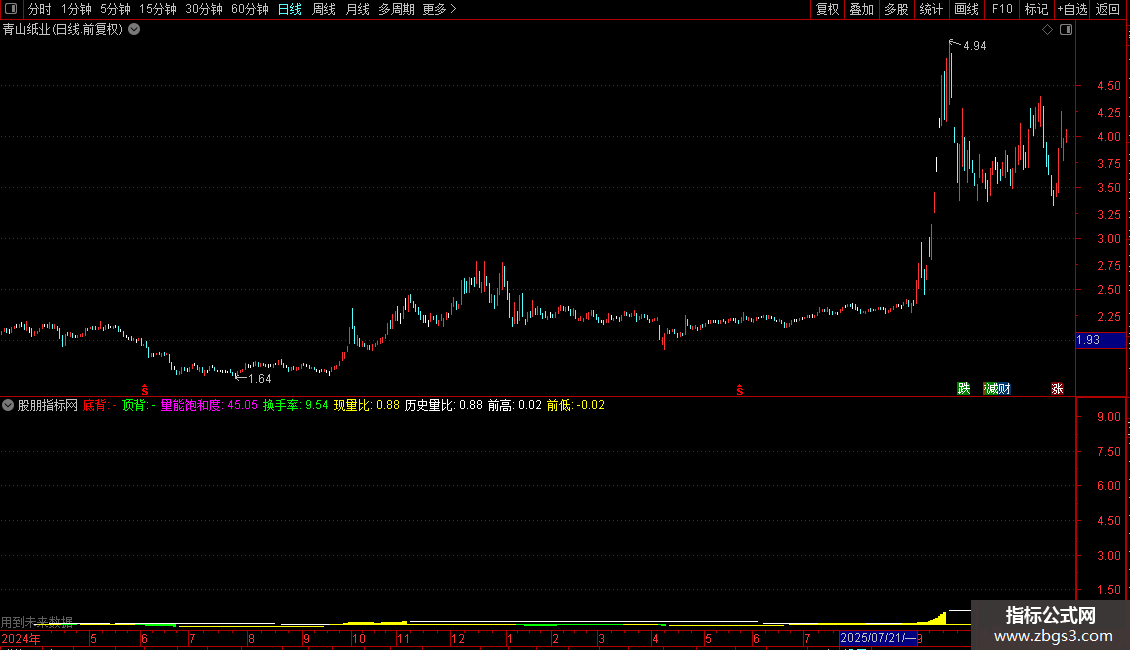 量能饱和度:IF((AMOUNT/C)/(HHV(AMOUNT,20)/HHV(C,20))*100>100,100,(AMOUNT/C)/(HHV(AMOUNT,20)/HHV(C,20))*100),NODRAW;