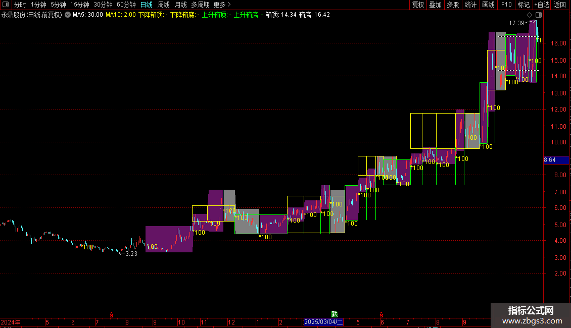 上升箱顶:IF(T2>=0 AND T2<=REF(BARSNEXT(XIA),T2),REFX(红止高,BARSNEXT(XIA)),DRAWNULL),COLORGREEN;