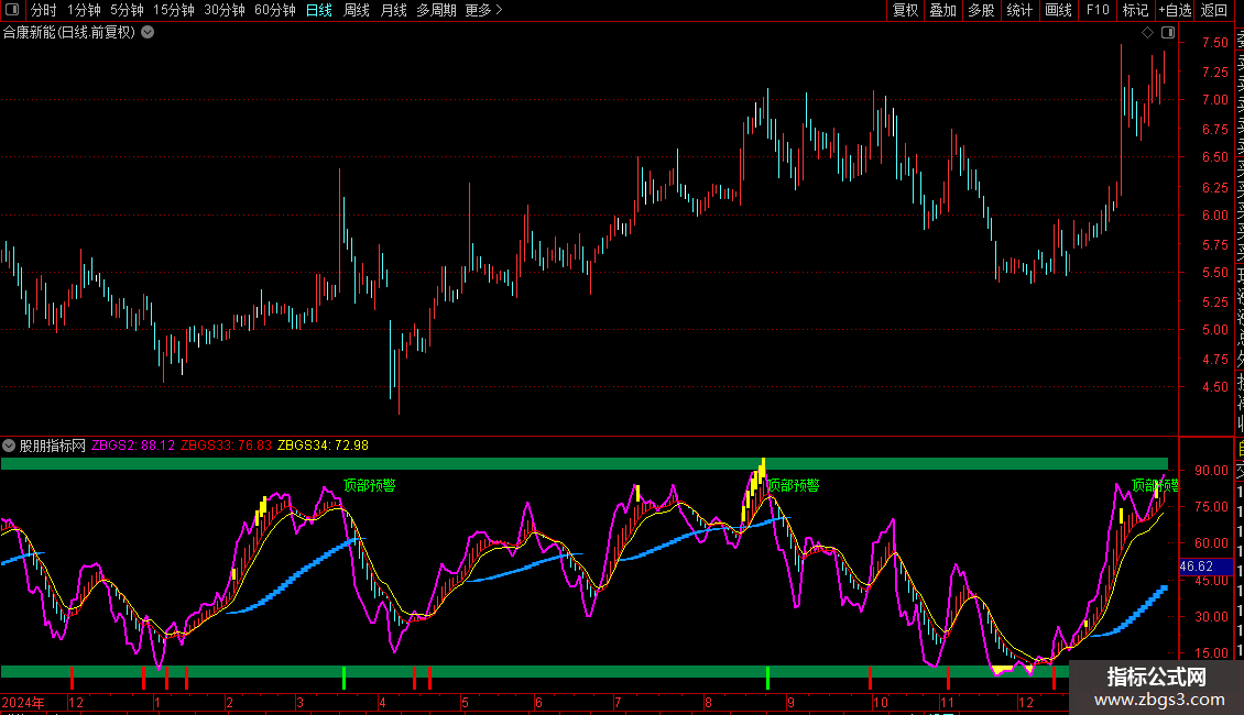 2. 顶部风险:出现“顶部预警”绿色文字,或ZBGS50下穿84时,提示顶部区间,建议逢高止盈;