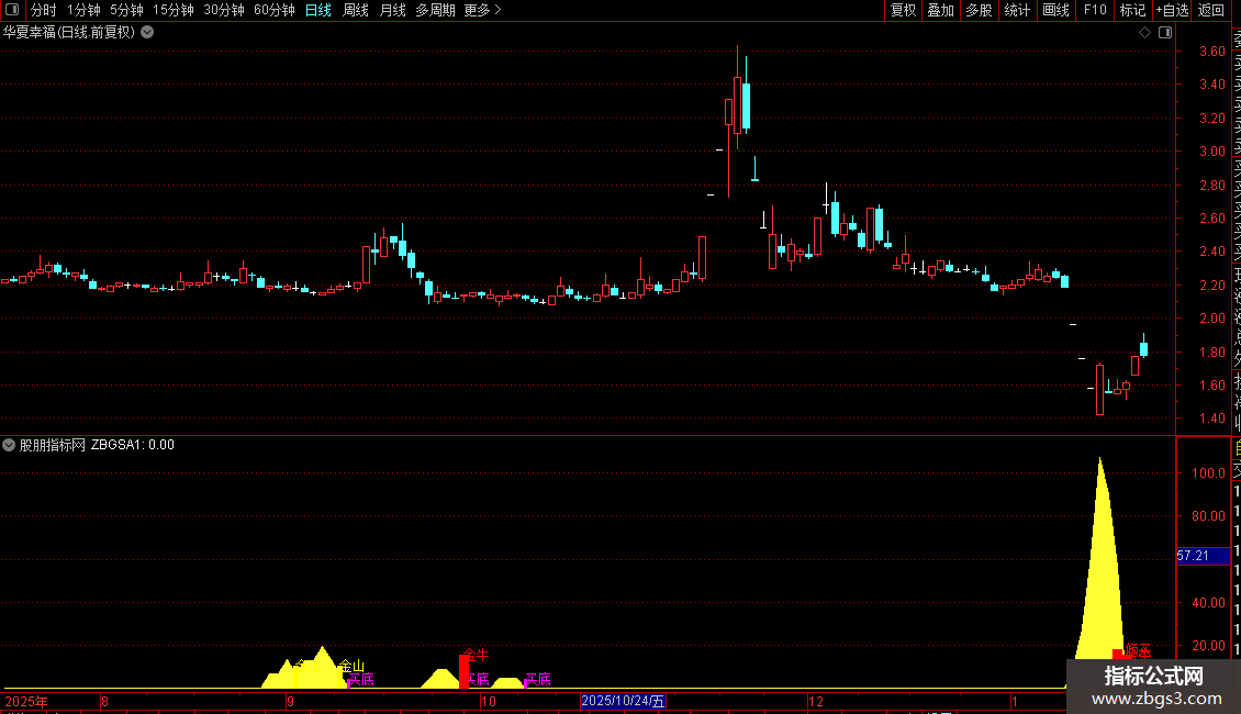 1. 信号识别:出现“买底”(紫色柱)代表初步底部机会,“金山”(黄色柱)提示中期底部确认,“倾买”(红色柱)为强势底部信号,“金牛”(红色柱+文字)是高确定性底部机会;