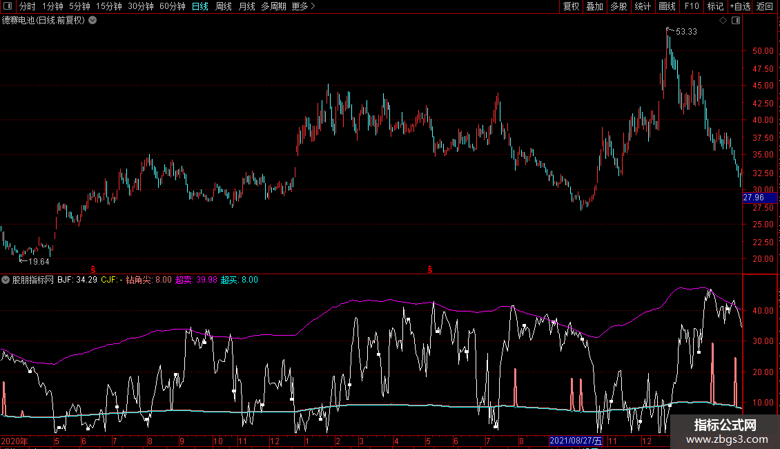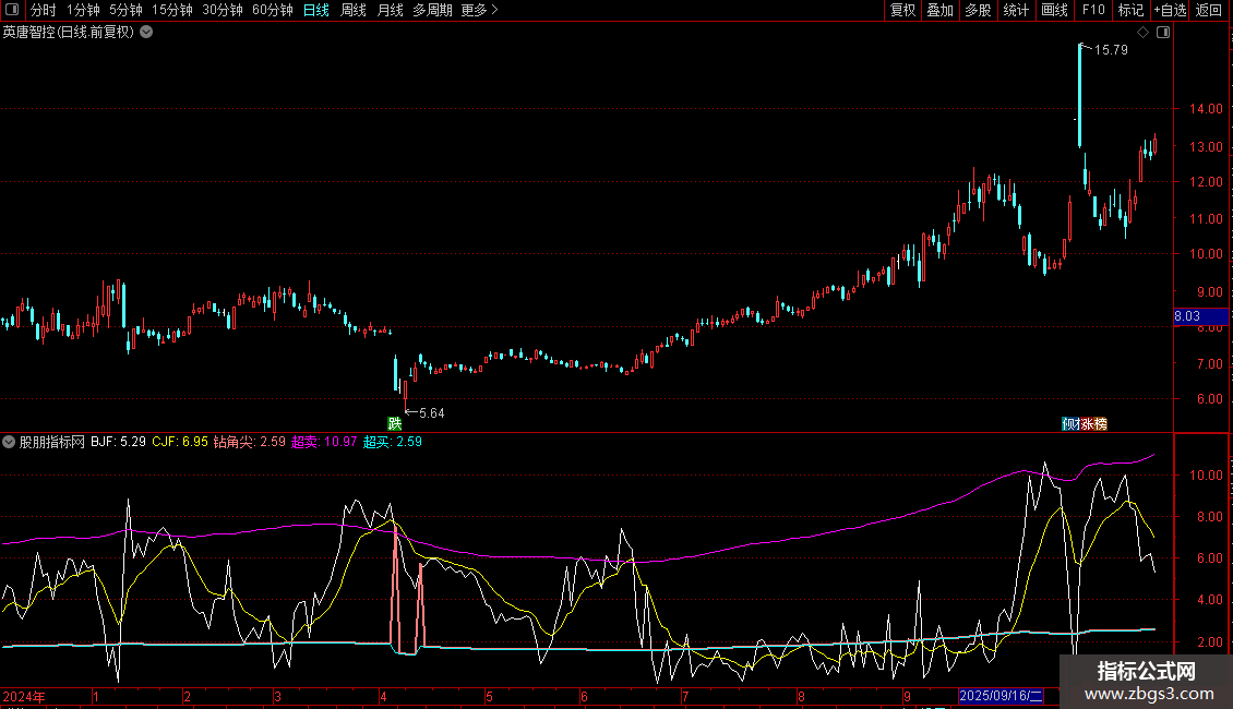 钻角尖:POW((JRB/5-REF(JRB/5,1)),8)*8000+JRB/5,COLORLIRED,LINETHICK2;
