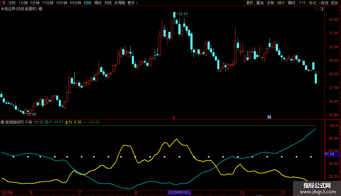 DRAWICON(CROSS(主力,散户) AND 主力>50,平衡,25);