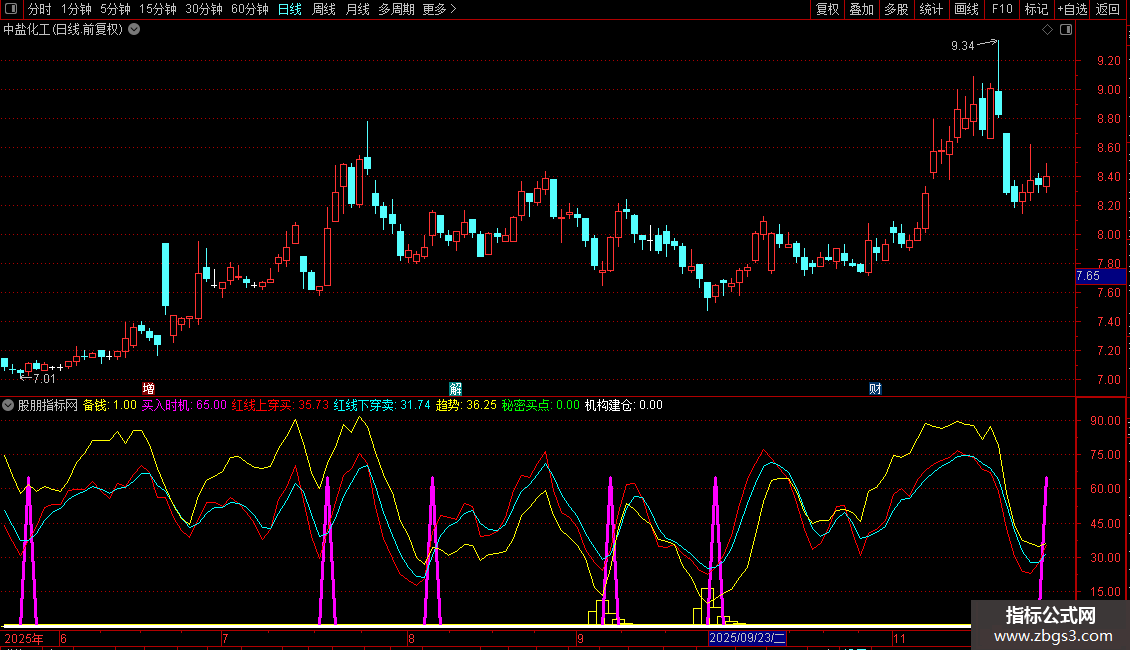 买入时机: IF(CROSS(J,3),65,0),COLORFF00FF,LINETHICK3;