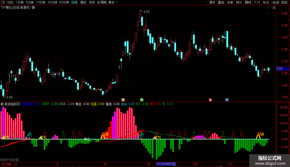 质:IF(LLV(DX,2)=LLV(DX,7) AND COUNT(DX<0,2)>0 AND CROSS(DX,MA(DX,2)),5,0),COLORRED;
