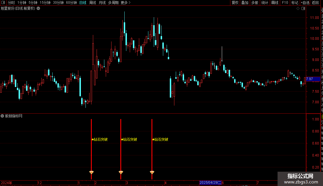 指标主要通过计算价格与成交量的变化率,结合成本分析来识别股票的强势突破点。它首先定义一个综合价格指标,并通过指数平滑处理,求得其变化率和移动平均值,以评估趋势强度。同时,考量成交量变化率及成本分布情况,筛选出具有高度集中度且伴随显著放量上涨特征的个股作为“钻石突破”信号。当市场出现这种强突破时,通常预示着股价可能进入快速上升通道。