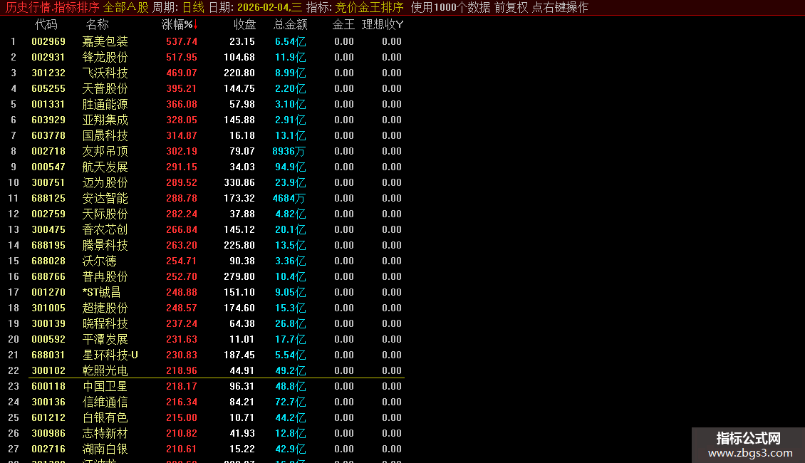 “竞价金王排序”是一款专为捕捉强势竞价个股设计的通达信排序公式。它融合了竞价金额、换手率、开盘溢价、历史涨停特征、量价结构及板块属性等多重因子,通过复杂的逻辑筛选出具备高开潜力、资金抢筹明显且技术形态健康的标的。