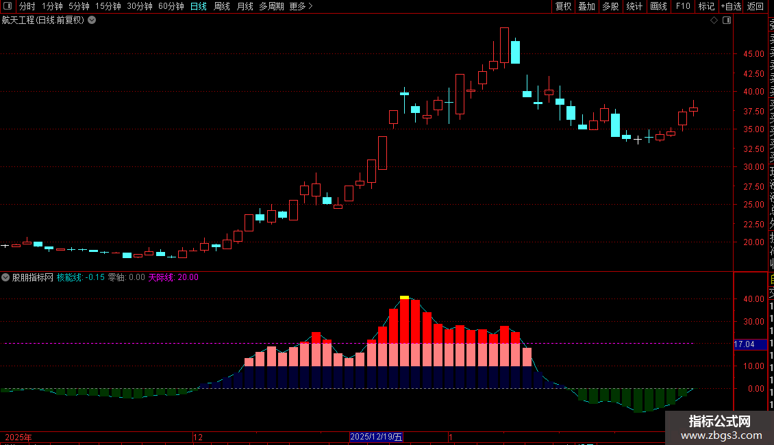 该指标结合价格偏离均线的程度与随机指标KDJ的平滑值,构建出核能线和量化资金两条核心曲线,用于判断股票趋势强弱与资金动向。当趋势向上、资金线上穿核能线且成交量明显放大时,触发暴力加仓信号,提示强势介入机会;当核能线从低位上穿负15时,提示潜伏布局信号;若核能线高位下穿资金线,则发出减磅警戒信号。整体策略侧重于趋势确认、量能配合与高低位反转信号,是一款实用的股票指标公式。
