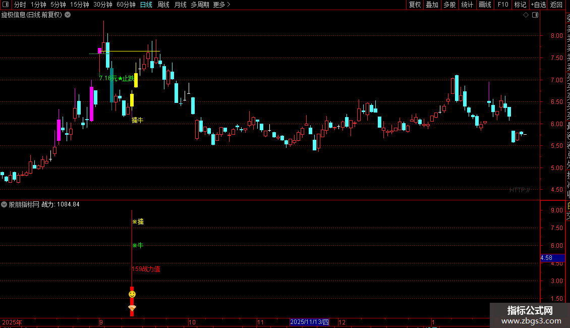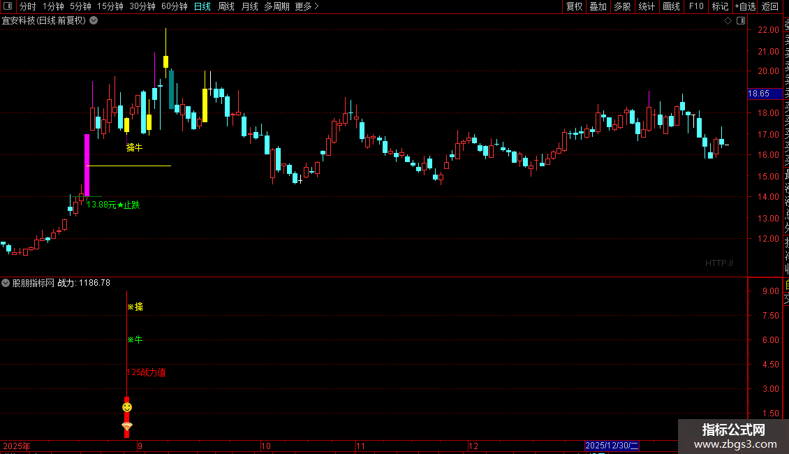 - “强弱通道”:通过品红/青色的K线和柱状线,直观显示股价的强支撑与压力区域。