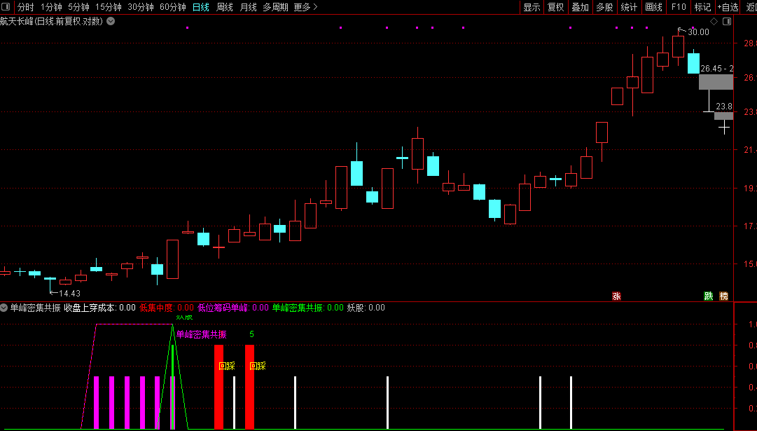 副图指标中,同时出现“单峰密集共振”和“妖股”信号的时候,往往是转折点,选股指标选出来这个位置的信号,指标用到了筹码和获利盘的函数,对于启动点把握不错,单峰密集区是紫色柱子,要结合股价的位置,低位最好。筹码类型公式用得到cost和winner函数不喜勿下!