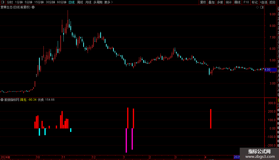 指标是通过筹码角度分析主力的进退趋势,红柱出现时表示主力开始加大持筹力度,向下的粉柱出现时表示主力筹码见底往往也是反转的信号,青色柱出现时表示主力筹码有出逃情况,注意顶部风险。