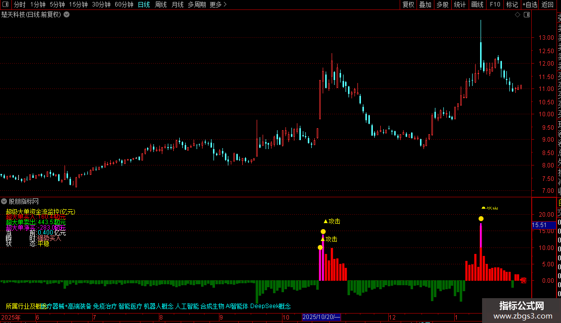 指标主要用于实时监控市场中超级大单资金的流向与活跃程度,通过识别大额成交是否伴随价格上涨,判断主力资金是积极进场还是出逃。它不仅统计累计净流入/流出金额,还结合近期量能基准,评估当前资金动作是否异常,并据此划分攻击强度和资金状态。图表上用不同颜色柱体直观显示买卖力度,同时标注“强势攻击”“连续流入”等关键信号,辅助判断短期多空动能。