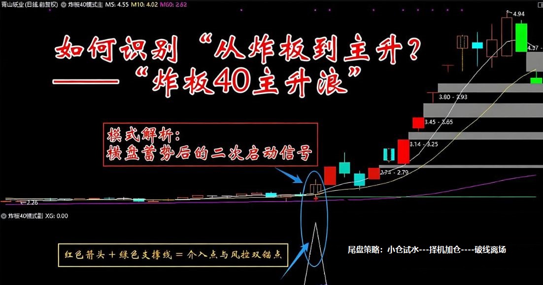 炸板40主升浪指标包含 1主图 1副图 1选股,识别从炸板到主升,横盘蓄势后的二次启动信号,无未来函数,无加密,可回测,手机电脑通达信通用,信号仅供参考。