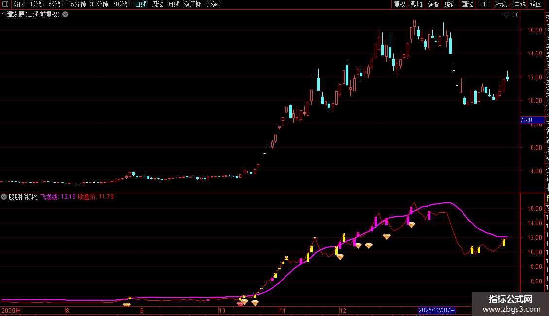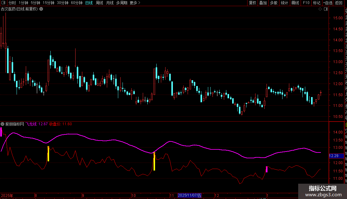 指标通过多条均线组合判断股价强势突破信号。首先构建一条基于短期指数均线的“飞龙线”,当股价上穿该线时提示潜在买点;其次,系统同时监测多个不同周期的均线,若当日开盘价低于多数均线而收盘价站上,则视为多头共振;再结合放量大涨、光头阳线等特征,筛选出高动能上涨K线,并用图标和彩色柱体突出显示。整体策略聚焦于捕捉短期强势启动或加速上涨的个股。