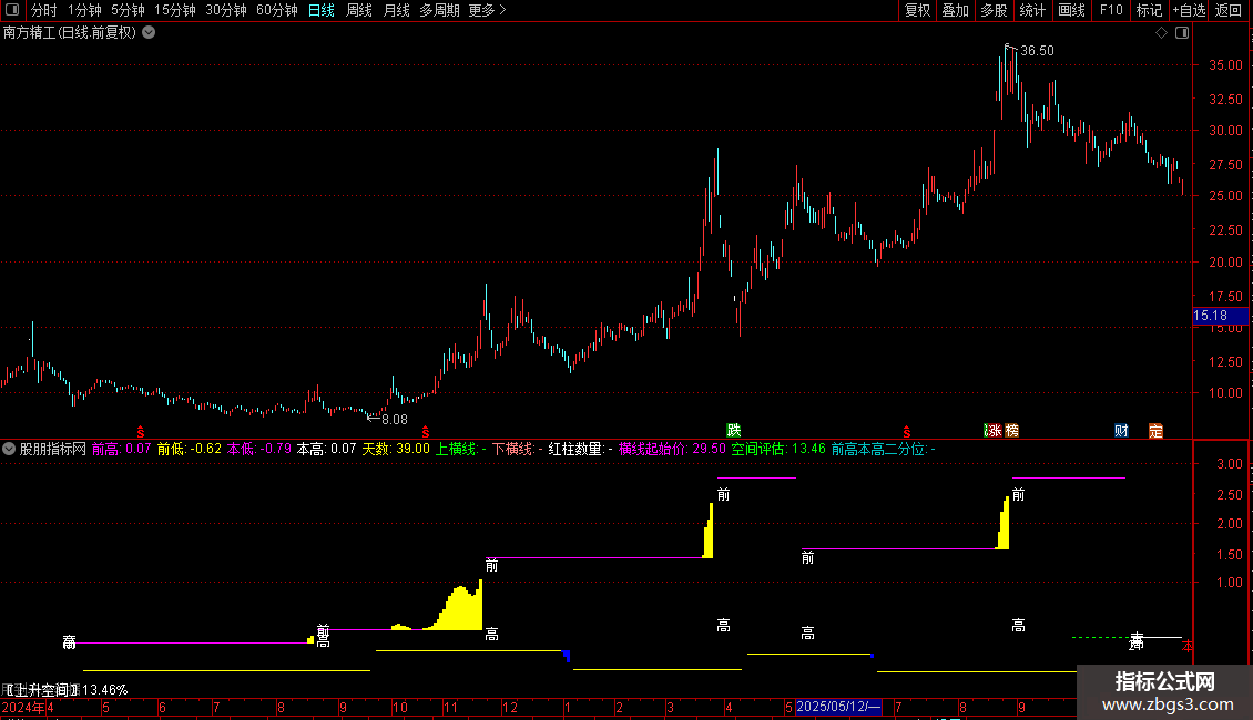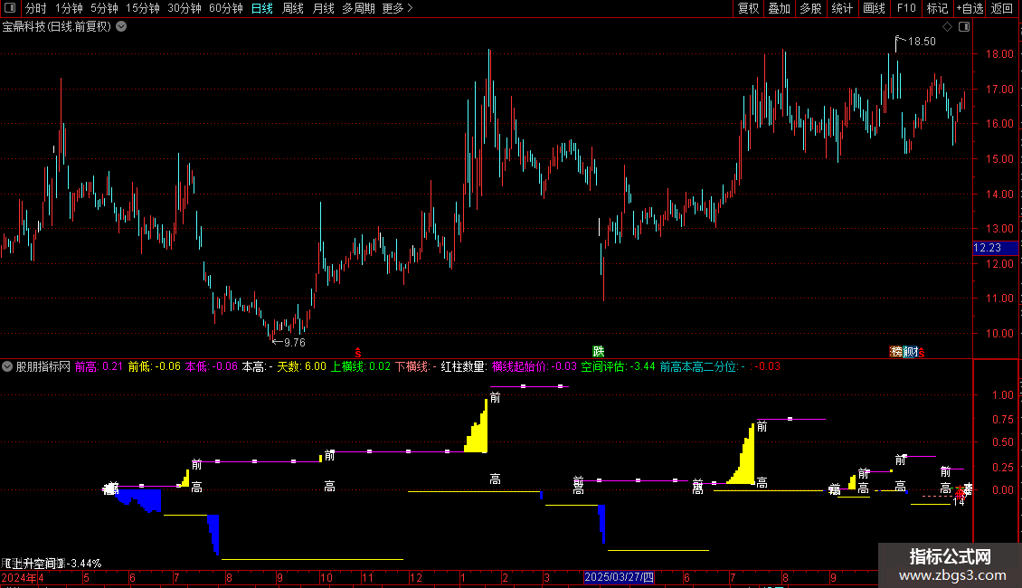 前高本高二分位:IF(MACD>0 AND 本高!=前高,DRAWLINE(WQG,(前高+本高)/2,REF(WQG,1),REF((前高+本高)/2,1),1)