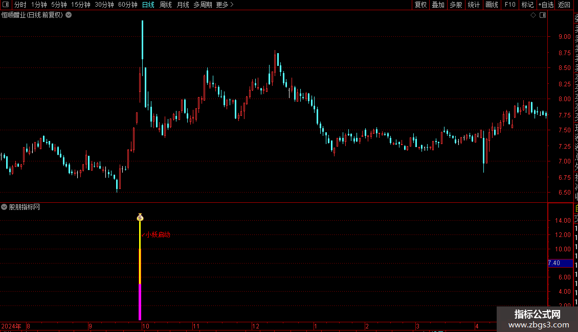 指标主要用于识别股价在经历短期调整或低位盘整后,出现放量强势反弹的启动信号。其核心逻辑结合了价格偏离均线的程度、成交量突增、短期动能增强以及特定K线形态(如阳线、涨幅达标等)进行综合判断。当多个条件同时满足时,系统会标记“小妖启动”信号,提示潜在的短线买入机会。