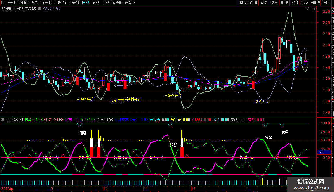 2.主副图趋势线出现开花形态,且出现铁树开花信号共振是机会。
