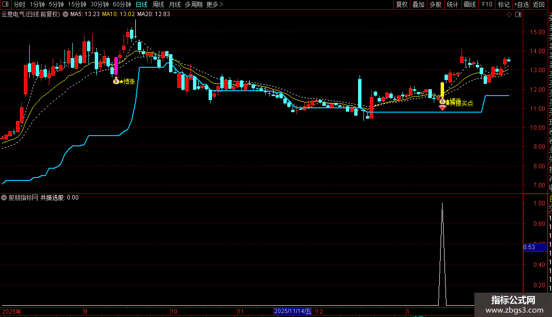 指标核心是「博涨强势信号 + 均线突破趋势信号」共振,双重验证提升买点可靠性;