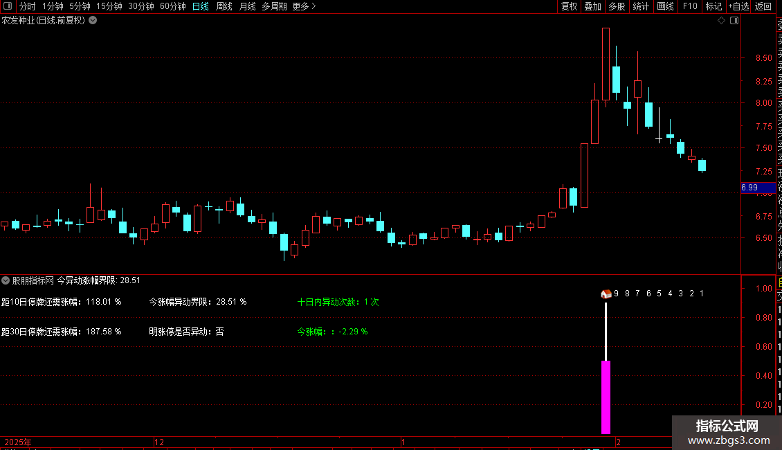 指标主要用于监控个股短期价格异动,通过对比个股与所属板块指数的相对强弱,识别显著跑赢大盘的异常上涨行为。系统会动态计算当前及未来涨停是否构成“异动”,并结合历史异动频次、所需涨幅阈值等维度进行综合评估。同时,在图表上标注近期成交量重复出现的时点,并在固定位置显示关键数据,如距停牌所需涨幅、当日涨跌幅、异动界限和十日内异动次数等,便于快速判断个股活跃度与监管风险。
