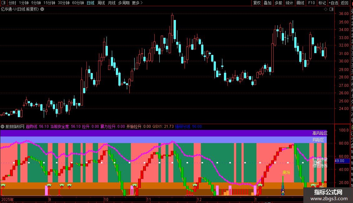 "乾坤波段王"是一款综合型波段交易指标,融合了RSI强弱分界、价格动能、安全边际监测三大维度。通过独特的双色柱状带划分持股持币区域,配合「趋势线」和「当前安全度」监控风险,更内置三大拉升信号系统(拉升/暴力拉升/开始拉升)及时捕捉主力异动。其核心通过比较价格在近期高低点间的相对位置,结合平滑处理识别趋势转折点。