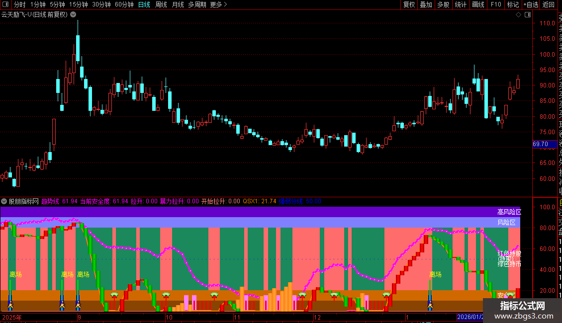 当前安全度:100-EMA(0.191*REF(ZBGS4,1)+0.809*ZBGS4,1),CIRCLEDOT,LINETHICK1,COLORFF00FF;
