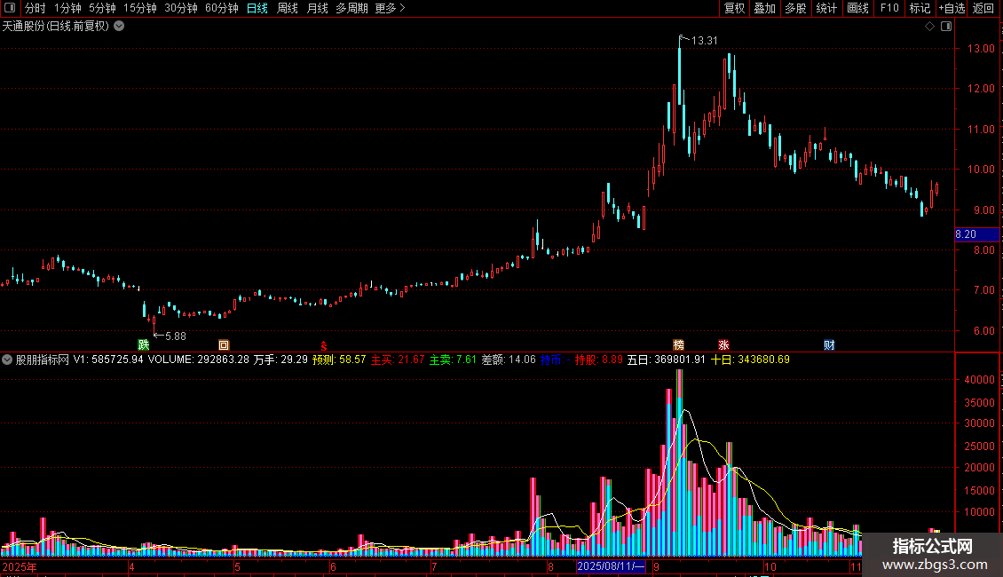 该指标在日线周期的当日K线上功能最全,会显示预测成交量及渐变柱线。