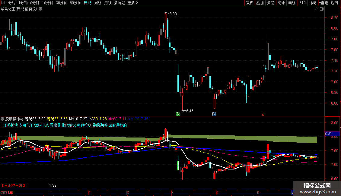 在K线图左上角显示“【三阳控三阴】”标题及前一日的“阳总量/阴总量”比值。该比值用于衡量近期买方(阳量)与卖方(阴量)的力量对比,比值越大,说明近期买方力量越占优。