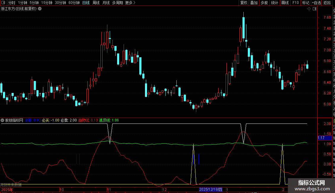 必买:使用TROUGHBARS函数寻找最近一个满足条件的波谷位置。若当前是波谷(结果为0)且最高价大于最低价加0.01,则输出1,否则输出-1。以黄色细线显示。