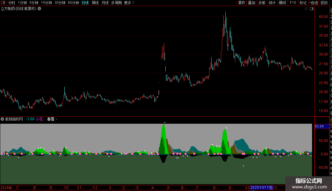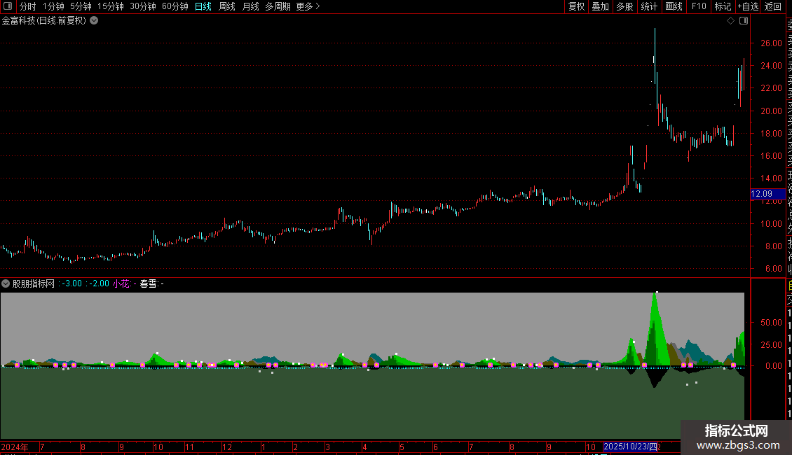 注意:指标信息高度密集,需结合价格走势综合判断。信号点(小花、春雪)仅为特定计算条件下的标记,并非直接的买卖指令。