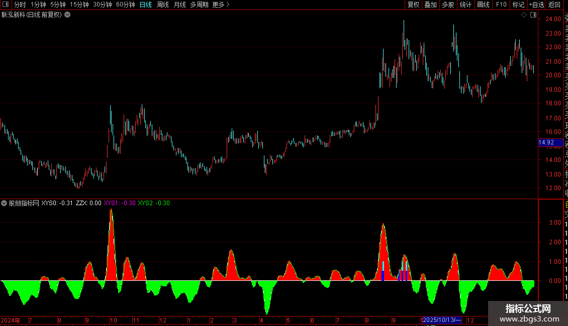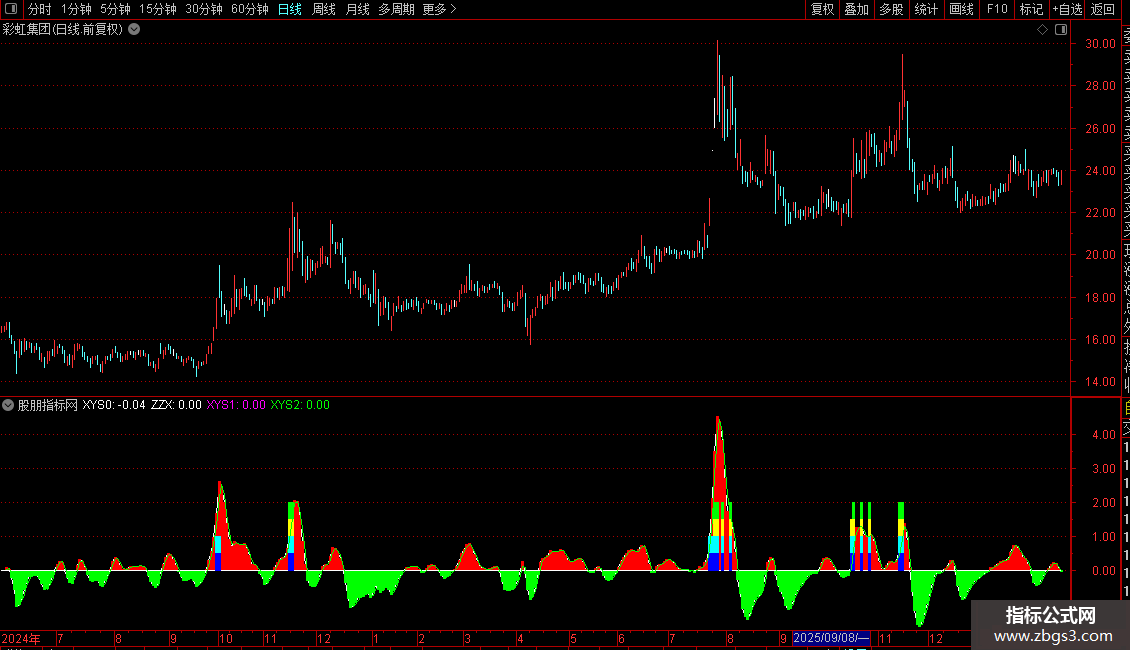 2. 风险信号:重点关注副图在高位(零轴上方)出现的彩色柱状信号。当`CYS13`(13日乖离率)大于5,代表短线获利盘较大,此时若`XYSHSL`(换手率)也处于高位,柱状信号会出现。换手率越高,信号柱高度越高,颜色从蓝、青、黄到绿,提示资金活跃度极高,需警惕短线获利回吐风险。信号柱出现是预警,并非直接卖出指令。