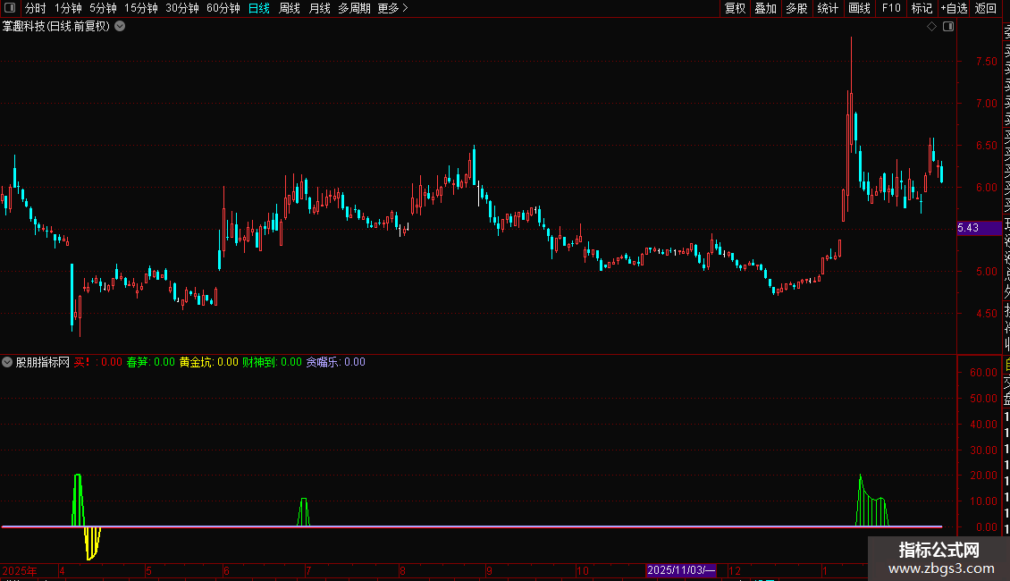 春笋: IF(VAR7 AND REF(CLOSE,1)<=COST(5),20,0),LINESTICK ,COLOR00FF00,LINETHICK2;
