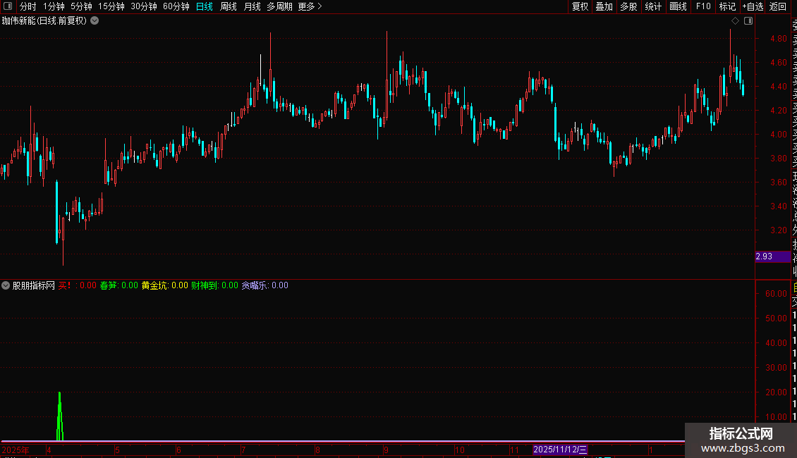 形态:在副图零轴下方出现黄色粗柱线,其数值为负。