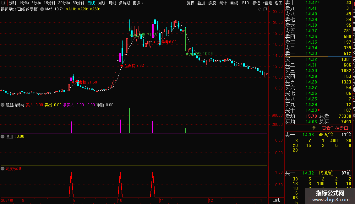 2、副图:买入净额为正时,显示紫色柱体信号,提示买入机会。副图股票指标精准匹配龙虎榜资金数据,辅助判断买卖时点。