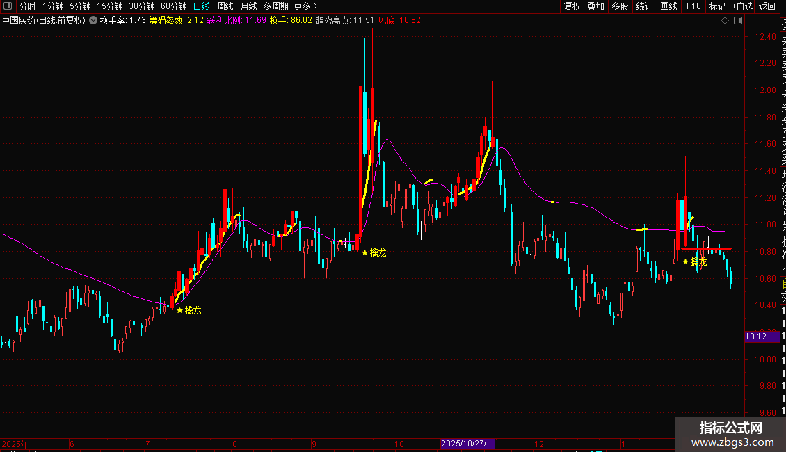1. 核心信号:K线下方出现黄色【★擒龙】为最强买入信号,代表股价突破多重均线压力+趋势反转,真龙启动确认;