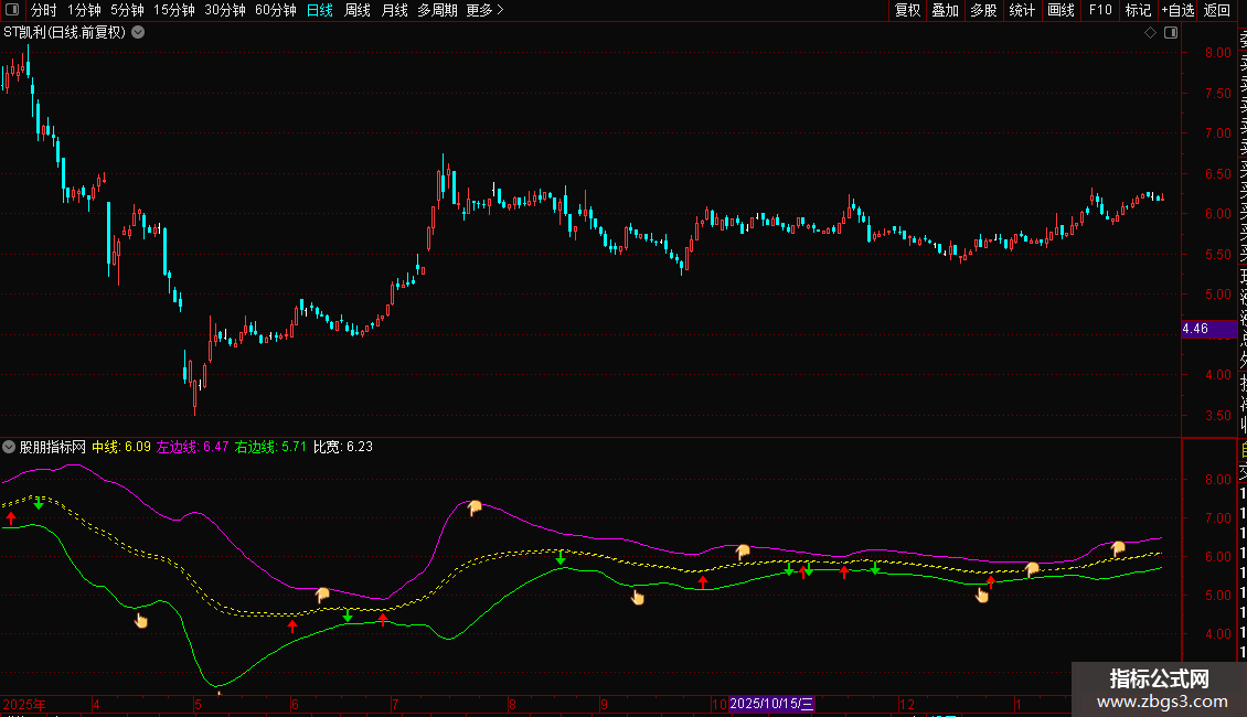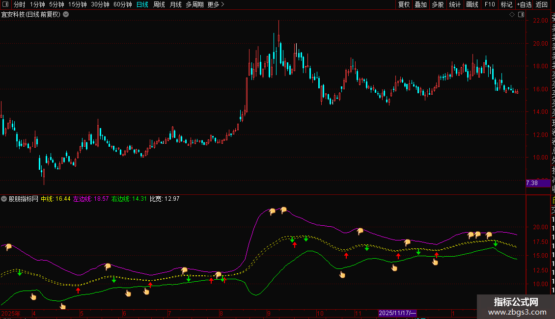 1. 指标性质:这是一个带有时间限制的通道类指标,包含中线、上轨(左边线)、下轨(右边线)以及买卖点信号。