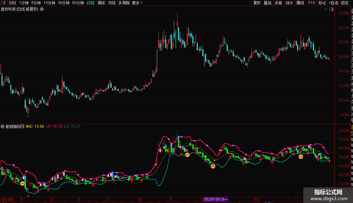 这是一个结合了多种技术分析方法的综合指标,主要用于识别趋势、波动区间和买卖信号。其核心构成和使用方法如下: