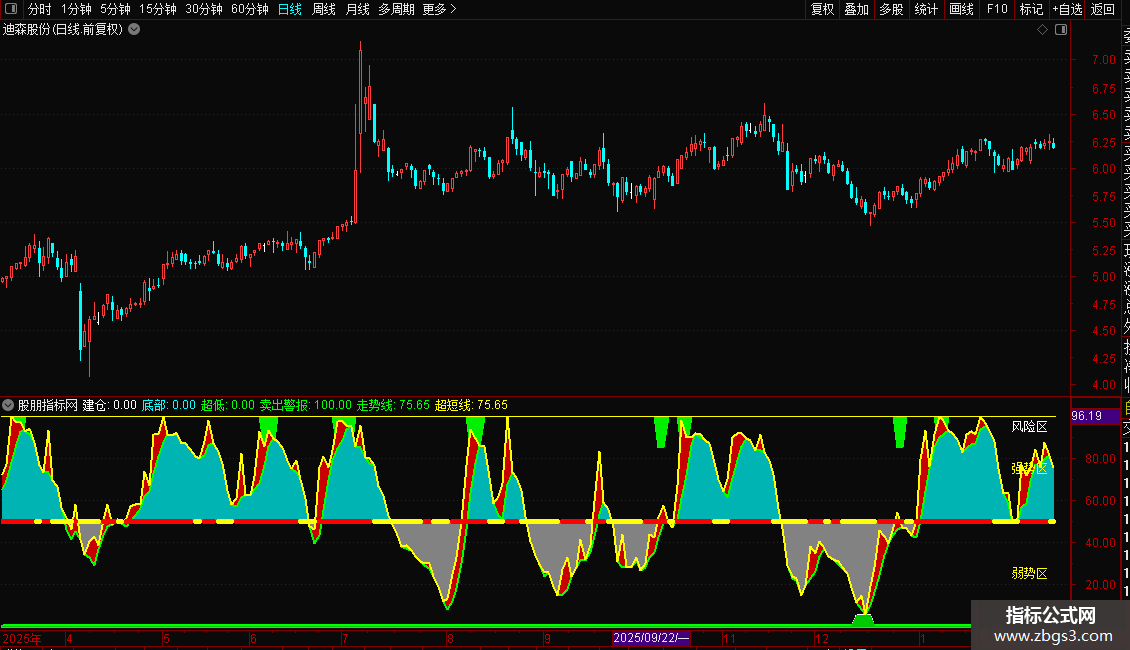 “强势区/弱势区”色带(NOTEXT1/NOTEXT2)与价格走势结合,可判断当前趋势是否有量价支持。