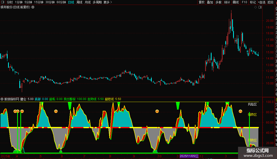 MN线:基于N1周期(通常为8日)的成交额均价计算的价格均线。它被用作强弱分界线。
