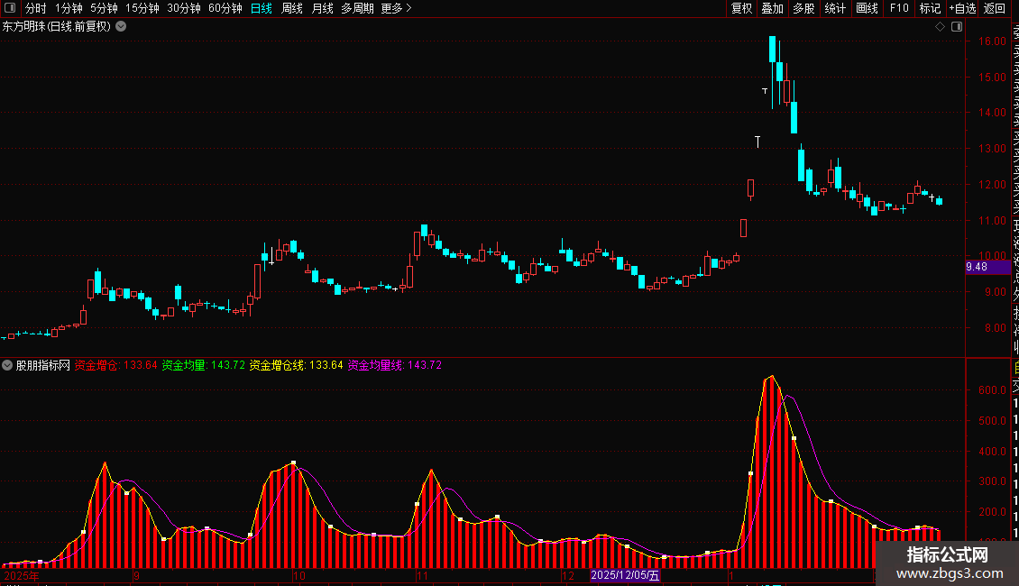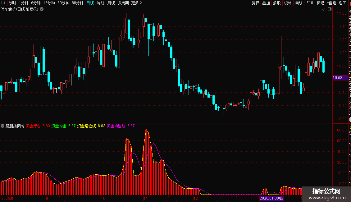 核心观察:关注红色粗柱线(资金增仓) 的出现及其高度,它表示经过公式模型判断后,符合条件的资金流入强度。