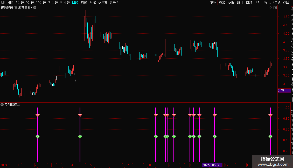 将公式加载到个股K线副图,当出现**紫色柱体+双钻石图标**时,为明确买入信号,信号同步匹配结果,可直观验证个股量价与指标共振有效性。