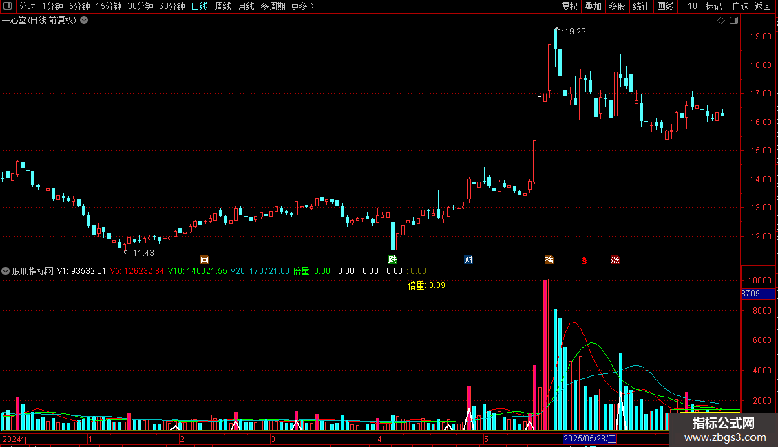 显示多条均线:`V3`(3日均)、`V5`(5日双均)、`V8`(8日双均)、`V10`(10日双均)、`V20`(20日双均)、`V89`(89日均)、`V100`(60日均)。