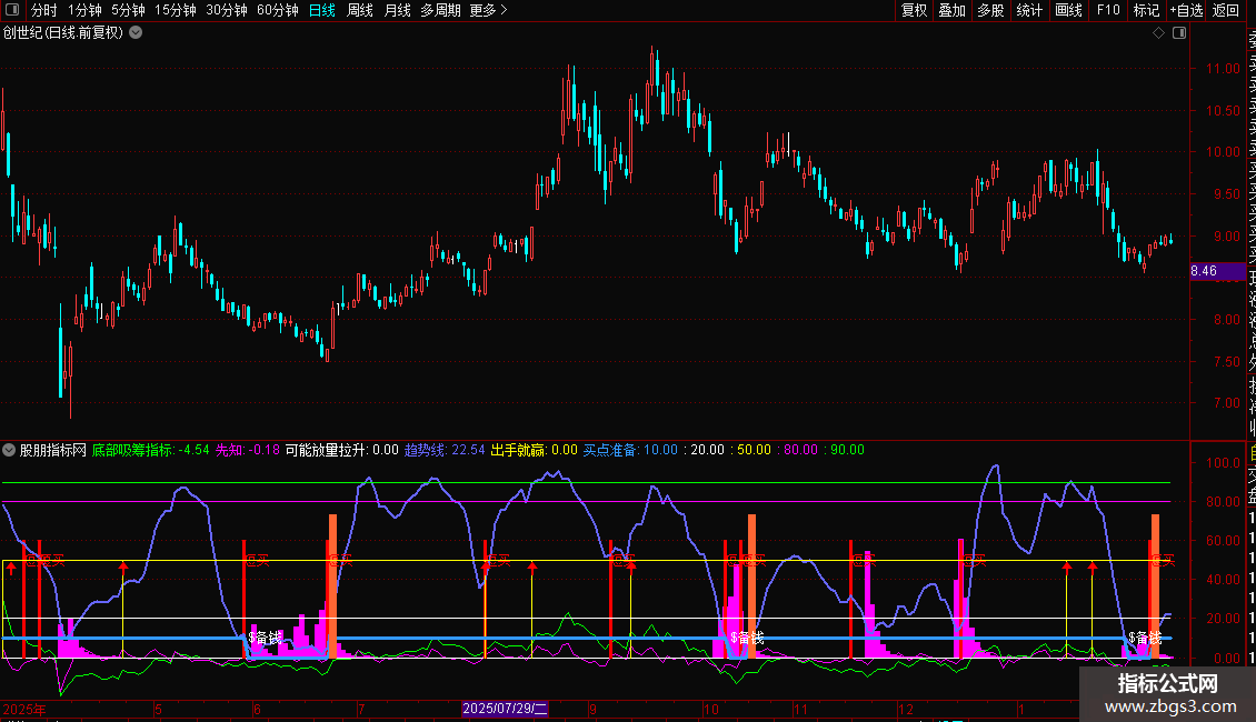 中线布局:重点关注“白色长柱”信号或“抄底”文字信号,并结合“底部吸筹指标”是否从极低值(如-24以下)开始拐头向上。