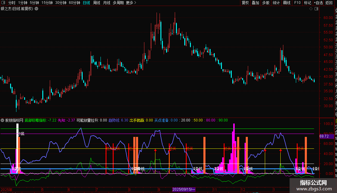用法:这是一个强烈的“抄底”触发信号。当“底部吸筹指标”从下方上穿-24时,会触发一根贯穿画面的白色长柱,提示可能的中线买点。