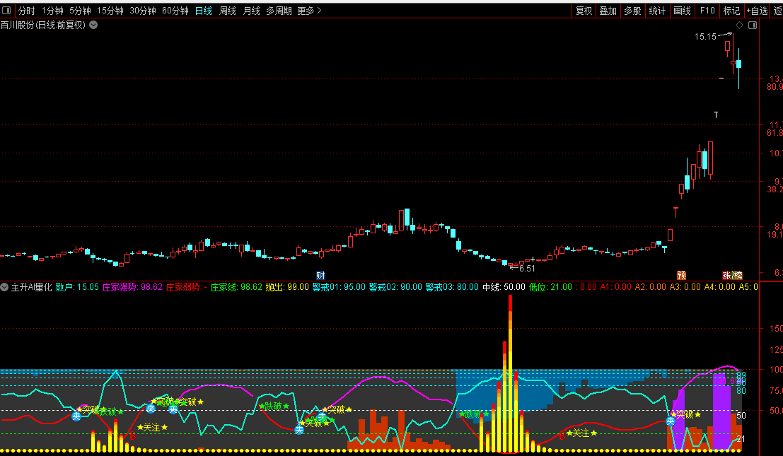 信号捕捉:出现黄色“★突破★”信号时,代表庄家线上穿散户线,为关注信号;若出现“跌破”信号,则需警惕回调风险,考虑离场。