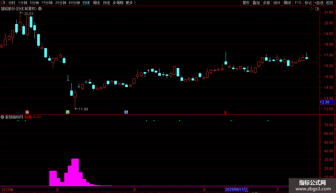 “主力跟踪”柱状图(洋红色):是“吸筹”线的柱状表现形式,更直观地显示吸筹力度的变化。柱体出现并升高,表示主力吸筹行为活跃。