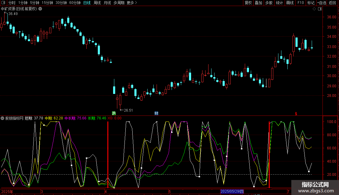- 中长期:基于4N周期(默认20日)计算威廉超卖值,用洋红色线显示。