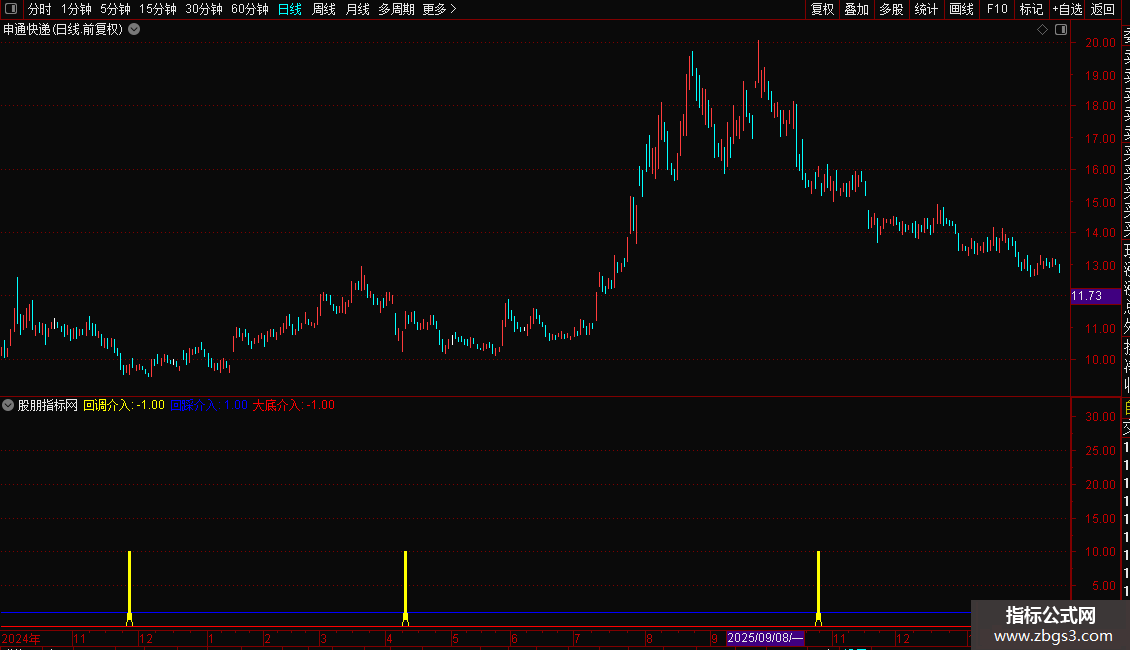 1. 副图公式:导入通达信副图指标,图表中黄色柱=回调介入、蓝色柱=回踩介入、红色柱=大底介入,直观显示当日信号;